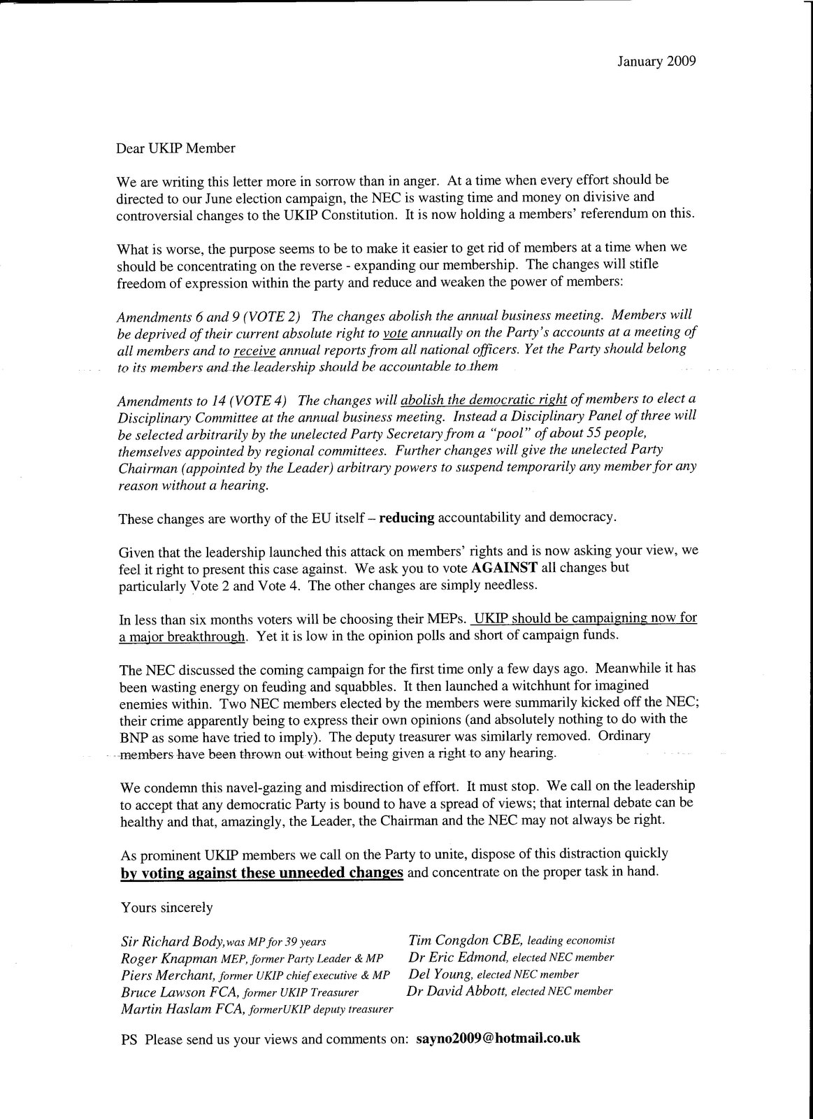 We are writing this letter more in sorrow than in anger. At a time when every effort should be directed to our June election campaign, the NEC is wasting time and money on divisive and controversial changes to the UKIP constitution. It is now holding a members’ referendum on this.