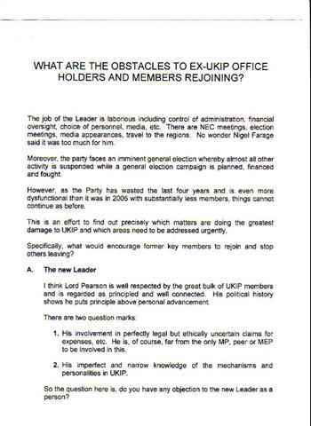 Lord Pearson delegated contact with senior former members of UKIP with the intention of holding small lunch parties at the House of Lord. He has encountered resistance! That is no surprise. Whilst he sorts out this problem a small group is proposing to attack the situation from the flank.