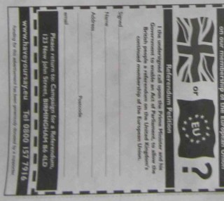 Impressively just below the cut out coupon, which should bring in a really good selection of people Nation Wide in support of this cross party campaign to Petition the Government to enact a Bill for an In/Out Referendum relative to The EU – The great thing if you look closely is that being cross party and Patriotic on a Nationwide basis it states: