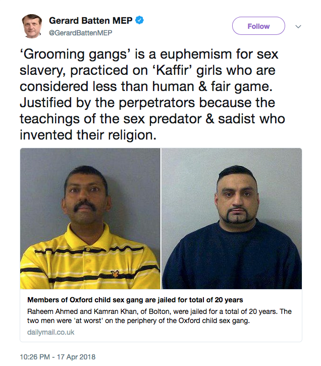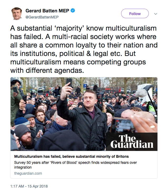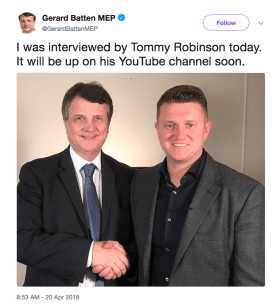 At next month’s local elections, UKIP will not stand candidates in many contests. The party is expected to be all but wiped out after results have been declared, not helped by a series of defections and resignations along the way. Worse, the far-right has been making inroads into UKIP support. So Adolf von Batten has decided to cosy up to them, although perhaps he should read the party’s rules first.These state “Membership is not available to anyone who is or has previously been a member of the British National Party, the National Front, the UK First party, the English Defence League, the British Freedom Party, British People’s Party and the Britain First Party (or any other parties or organisations later added to the proscribed list). Any applications made from people who are or have been members of these organisations will be refused, and any subscriptions collected will be refunded. By making an application for membership, the applicant certifies that he is not and has never been a member of either of these parties”. So what has Batten’s response been?Simples. He has decided to cosy up to Stephen Yaxley Lennon, who styles himself Tommy Robinson. Lennon brings a considerable following to the table, but he also has significant baggage: founder of the EDL, a criminal record which includes convictions for violence and fraud, and an ability to be highly economical with the actualité.None of this appears to have fazed Batten, who has given Lennon his endorsement by sitting down for an interview, the culmination of his own long march towards intolerance, typified by assertions such as “A substantial ‘majority’ know multiculturalism has failed. A multi-racial society works where all share a common loyalty to their nation and its institutions, political & legal etc. But multiculturalism means competing groups with different agendas”. Loyalty. Isolating the disloyal. But not Jews. Yet.Who might be “disloyal”? Ah, but he has an answer to that, too: “‘Grooming gangs’ is a euphemism for sex slavery, practiced on ‘Kaffir’ girls who are considered less than human & fair game. Justified by the perpetrators because the teachings of the sex predator & sadist who invented their religion”. Inflammatory hate speech, as well.Who does he follow in such matters? “This talk by Mark Steyn is absolutely brilliant as a critique of modern Britain. It’s nearly half an hour but well worth listening to”. Steyn is another bigot, who claims that everyone in Europe will soon be living in a continent he calls “Eurabia”. Steyn, who likes to talk about “breeding”, falls back on the same excuse as Lennon: “My book isn’t about what I want to happen but what I think will happen”.Only telling it like it is. Not racist, because Islam is a religion, innit? It’s only “the truth”. Some of their best friends are brown and black. And Jewish.UKIP is now heading inexorably to the irrelevance of the far-right fringe. Good thing too.
