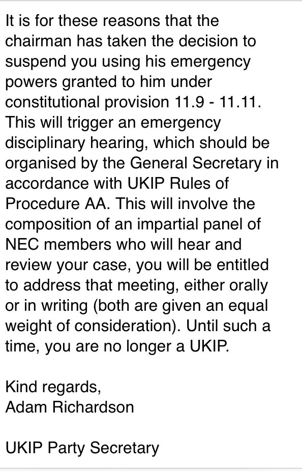5/6 He insists he didn’t instigate the disciplinary process against @MandyJonesAM but he backs it. It’s irrelevant that she’s not a group member. UKIP constitution says members shouldn’t campaign against UKIP nominees for a position