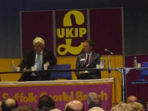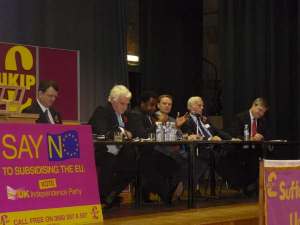 A panel line-up from left to right: Gerard Batten MEP, Mike Nattrass MEP, Delroy Young, John West, Derek Clark MEP, David Campbell-Bannerman (Deputy Leader and closely related to a Desk!).