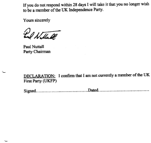 You will recall that Paul Nuttall sent certain €Ukippers a letter in which they were curtly informed that they must sign a declaration by the 28th April or face expulsion from the Party. The letter was published at the time on this blog and on this: LINK