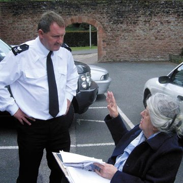 Elisabeth hands a response to a Police Sergeant from her wheelchair.
