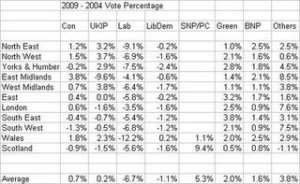If we look at the change in UKIP’s share of the vote from 2004 by a North South split the figures are: