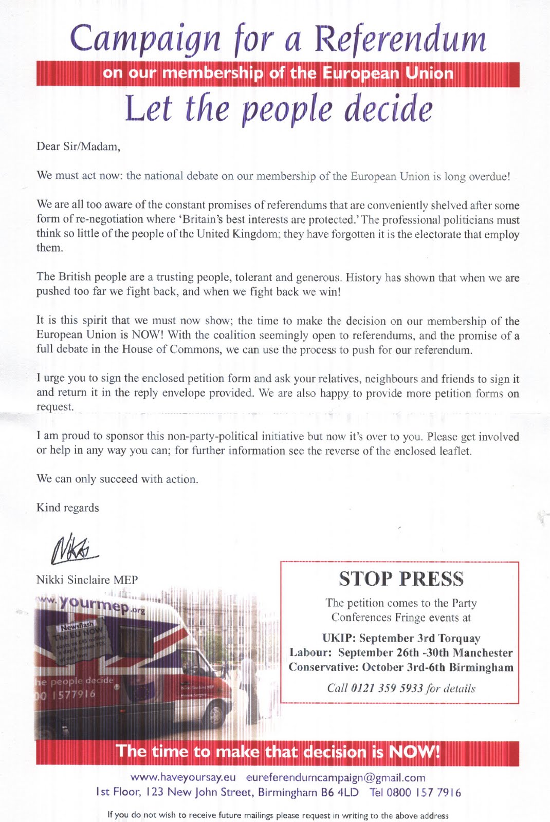I do understand that the aim is claimed NOT to be a rival or spoiling operation for Nikki Sinclaire’s efforts at a cross party petition to lobby Parliament – yes ours, what is left of it – to hold a debate towards an in out referendum for the British peoples.