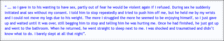 ” …. so I gave in to his wanting to have sex, partly out of fear he would be violent again if I refused. During sex he suddenly initiated anal sex without my consent. I told him to stop repeatedly and tried to push him off me, but he held me by my wrists and I could not move my legs due to his weight. The more I struggled the more he seemed to be enjoying himself, so I just gave up and waited until it was over, still begging him to stop and telling him he was hurting me. Once he had finished, he just got up and went to the bathroom. When he returned, he went straight to sleep next to me. I was shocked and traumatised and didn’t know what to do. I barely slept at all that night”.
